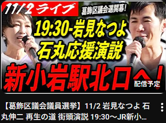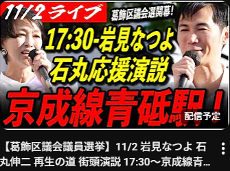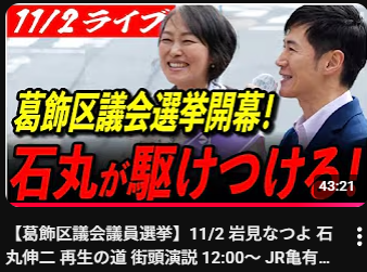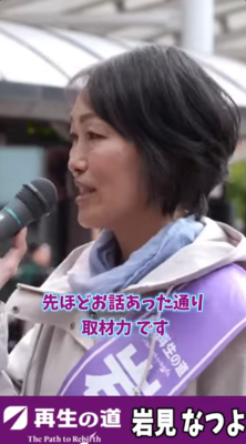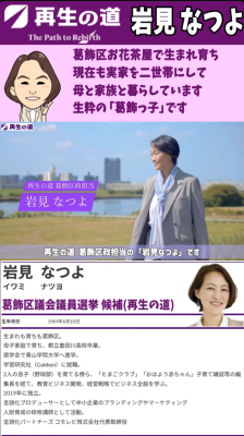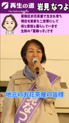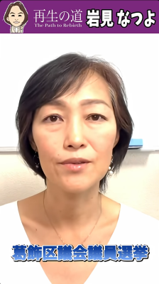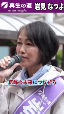 岩見 なつよ(葛飾区)再生の道 01再生の道メンバー(党員)岩見なつよ 2025.04.292025.11.10 目次 「岩見なつよ」最新情報岩見なつよ 葛飾区議会議員選挙 街頭演説ライブ応援ショート動画岩見 なつよ ブログ葛飾区議会議員選挙2025 予想される顔ぶれ再生の道 選考会 最終面接動画葛飾区議会議員選挙 前回2021年結果2021都議選結果予想される顔ぶれ地図(葛飾区) 「岩見なつよ」最新情報 【再生の道】岩見なつよ Live配信「選挙が終わって」まったりトーク2025年11月10日 投稿者: 【再生の道】葛飾区 岩見なつよ【再生の道】葛飾_岩見なつよ 神回✨ 民間de探求学習のオーソリティ! 教育と探求社創業者 宮地勘司さん登場!! #主体的学習2025年11月10日 投稿者: 【再生の道】葛飾区 岩見なつよ【再生の道】3分半!岩見なつよ 石丸伸二前代表との合同演説 Short Ver. #葛飾区議会議員選挙 #岩見なつよ2025年11月8日 投稿者: 【再生の道】葛飾区 岩見なつよ 岩見なつよ 葛飾区議会議員選挙 街頭演説ライブ 応援ショート動画 岩見 なつよ ブログ 葛飾区議会議員選挙2025 予想される顔ぶれ 再生の道 選考会 最終面接動画 葛飾区議会議員選挙 前回2021年結果 2021都議選結果 予想される顔ぶれ 地図(葛飾区)