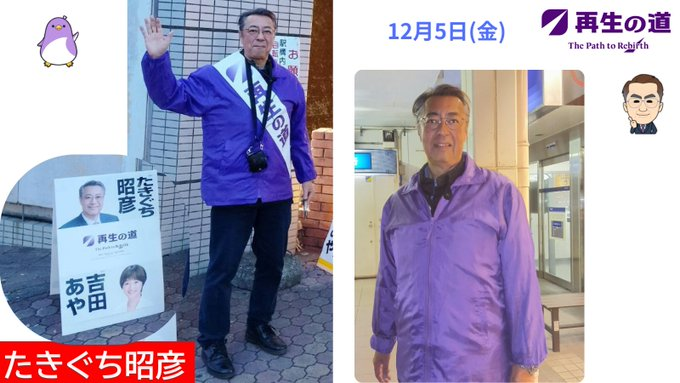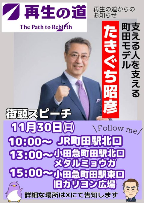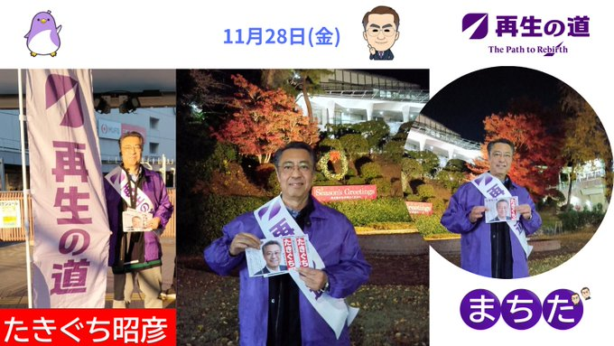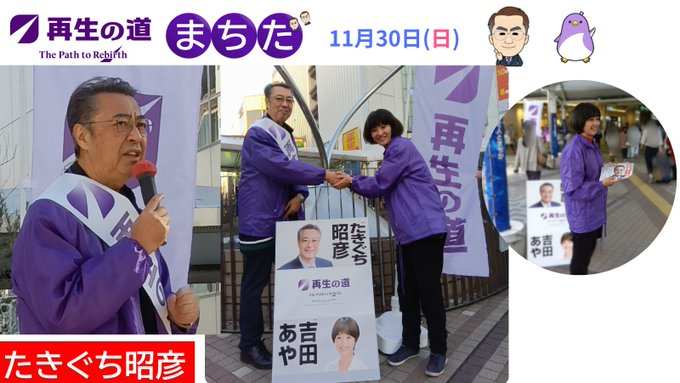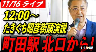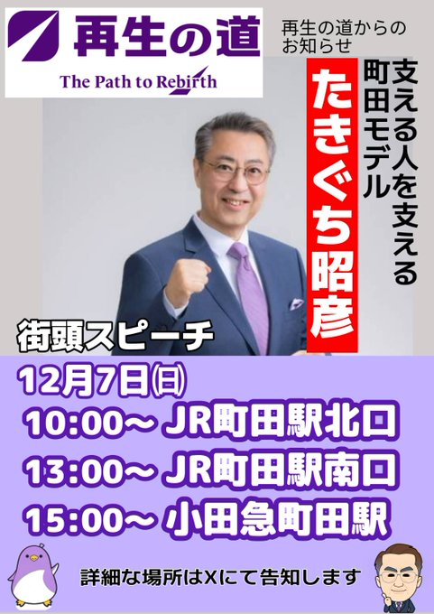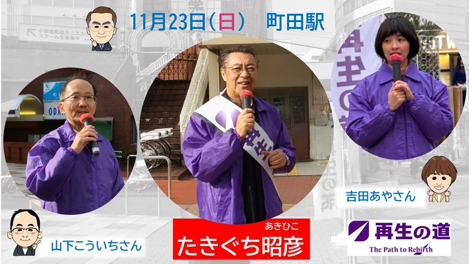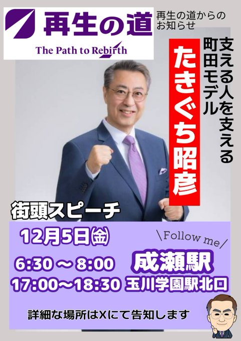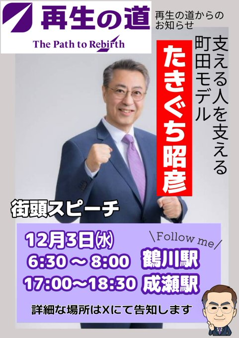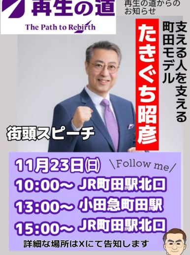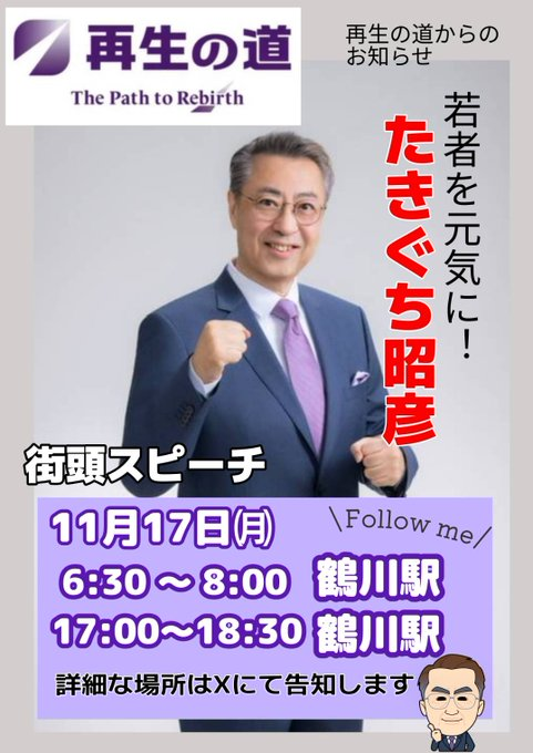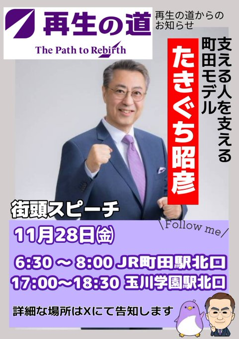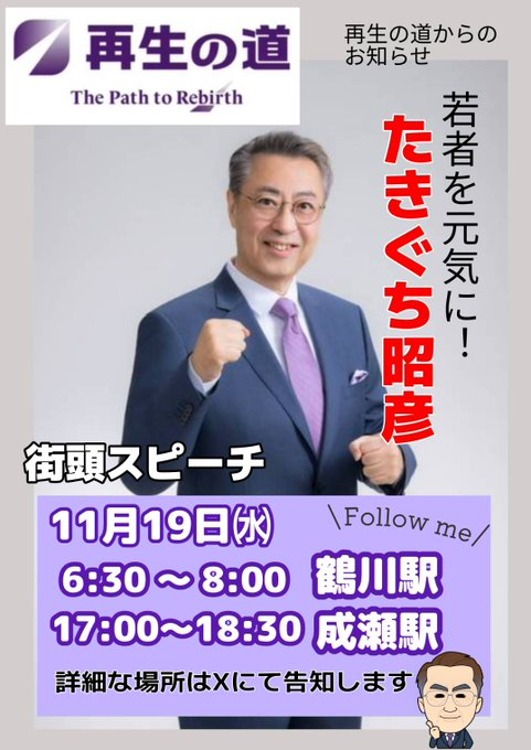 11/19(水)街頭にて「たきぐち昭彦」がご挨拶させていただきます。是非ともお声がけください。 時間または場所が変更される場合はXにて通知いたします。