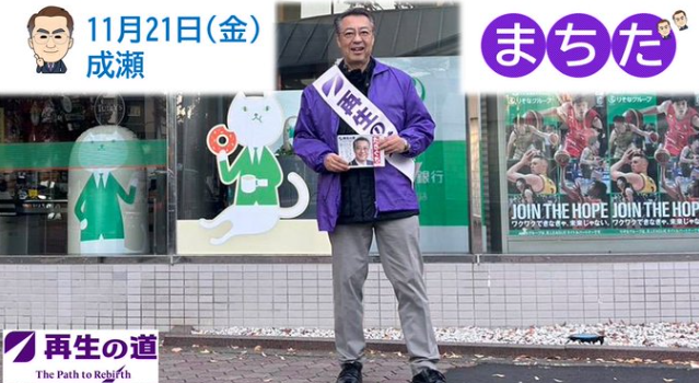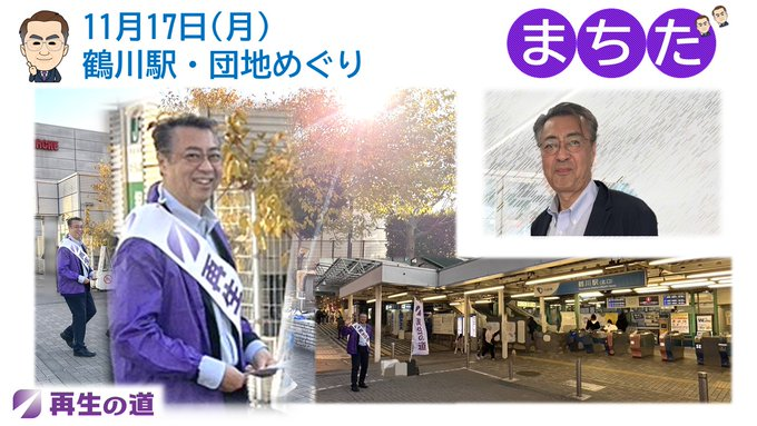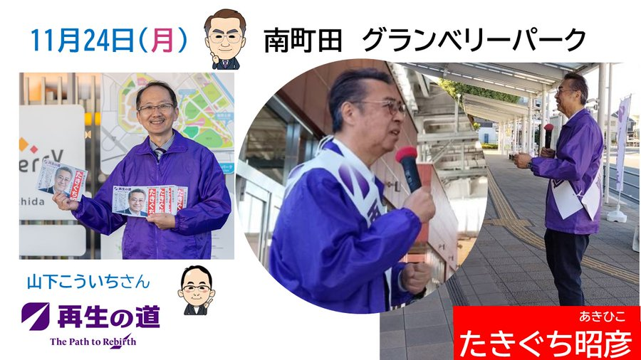 11/24 の活動報告です。 午前、午後ともに南町田グランベリーパーク駅にてご挨拶、街頭スピーチを実施しました。 【再生の道】から山下こういち さんも参加。 【再生の道】が支えてくれる町田市の【再生の道】活動。 テーマは「支える人を支える 町田モデル」