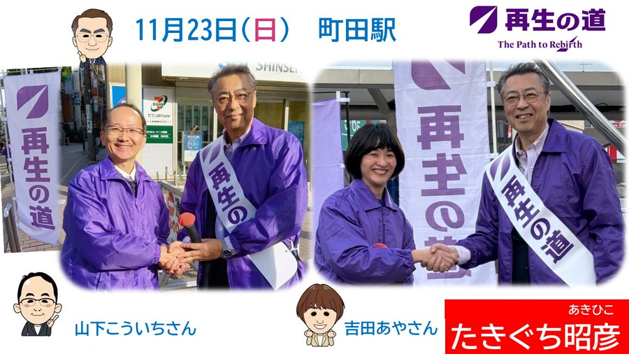 11/23 の活動報告です。 午前、午後ともに町田駅にてご挨拶、街頭スピーチを実施しました。 【再生の道】から山下こういち さん、吉田あや さんも参加。SP Jackyも登場。 【再生の道】が支えてくれる町田市の【再生の道】活動。 テーマは「支える人を支える 町田モデル」。