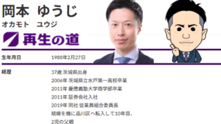 01再生の道メンバー(党員) 「岡本 ゆうじ 」(品川区)再生の道 新着情報「再生の道」最終選考面接動画2021都議選結果予想される顔ぶれ地図(品川区) 2025.04.29 01再生の道メンバー(党員)
